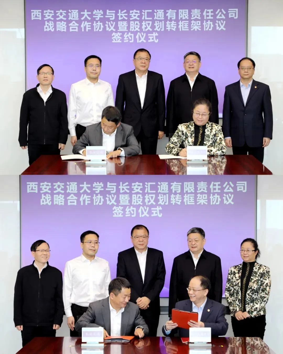 西安交大党委常委、副校长别朝红、柴渭分别与长安汇通党委书记、董事长陶峰代表双方签署战略合作协议和部分校办企业股权划转框架协议。省国资委党委委员、副主任李凯主持仪式。